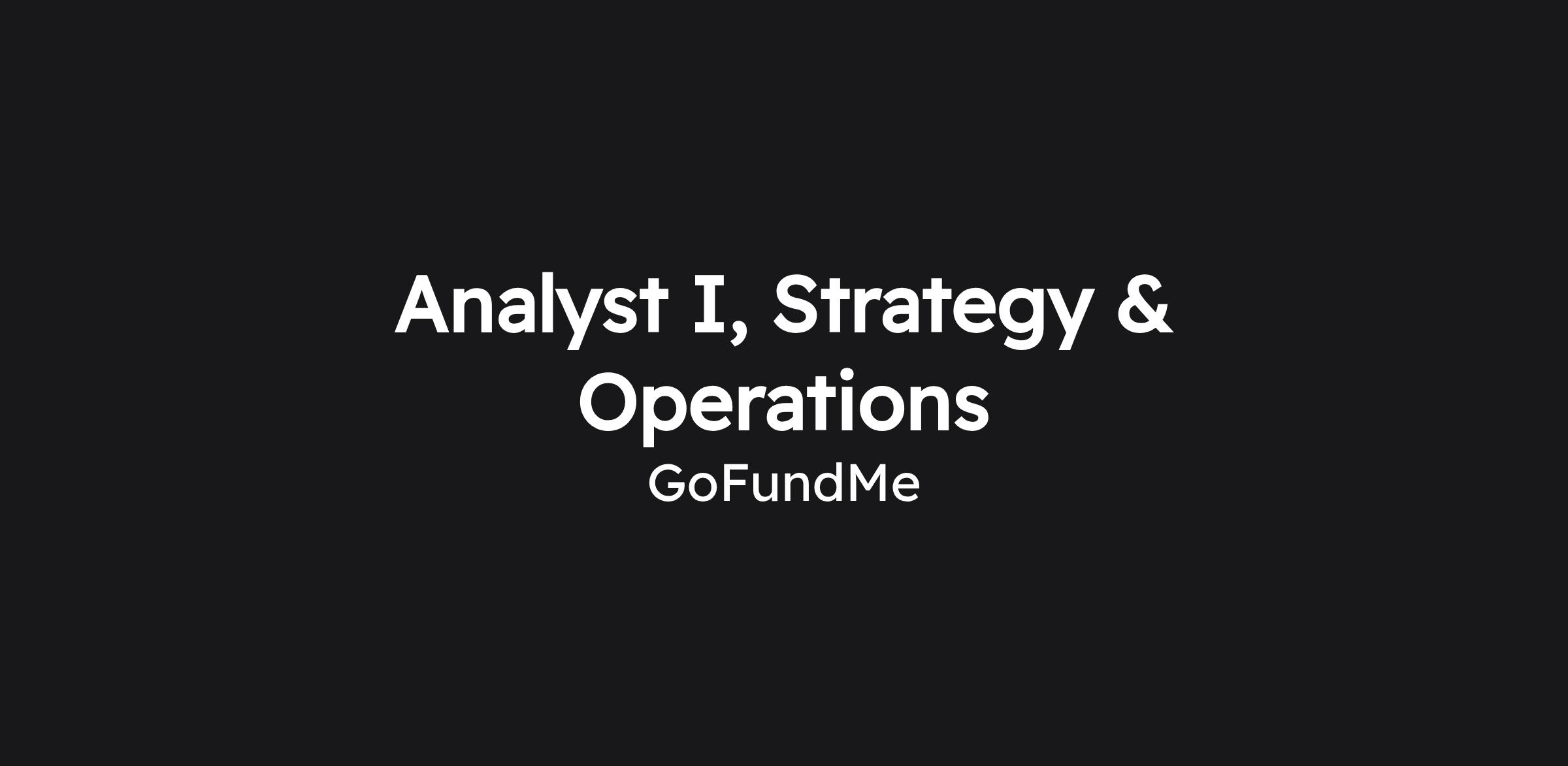 Join us! The GoFundMe team is searching for an Analyst I on the Strategy & Operations (S&O) team within Trust & Safety. S&O plays a critical role across the business to deliver the insights, clarity, alignment, and operational rigor that enable teams to scale with impact.