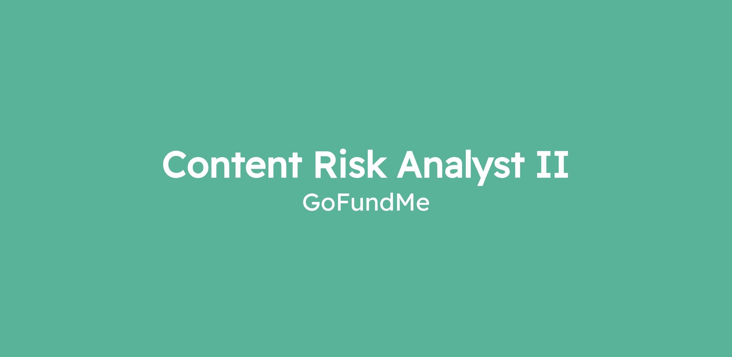 Join us! The GoFundMe team is searching for a Content Risk Analyst II to join our growing team. The Trust & Safety department plays a critical role in protecting our customers from fraud and misuse while ensuring GoFundMe remains a safe and trusted platform. By safeguarding the opportunity to give online, we help strengthen our brand, drive growth, and most importantly, do the right thing by our customers.