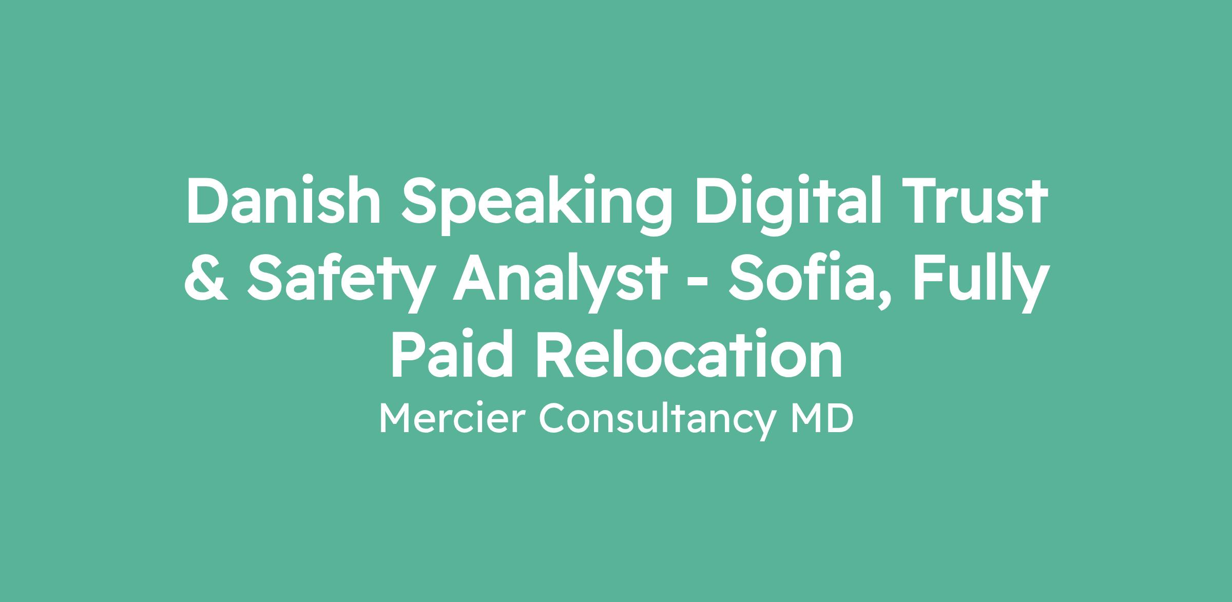 Mercier Consultancy MD is seeking a Danish Speaking Digital Trust & Safety Analyst to join our growing team in Sofia, Bulgaria. This role comes with a fully paid relocation package, providing an excellent opportunity to work in a dynamic and diverse environment. As a key member of our trust and safety team, you will help maintain a secure and positive user experience across our digital platforms.