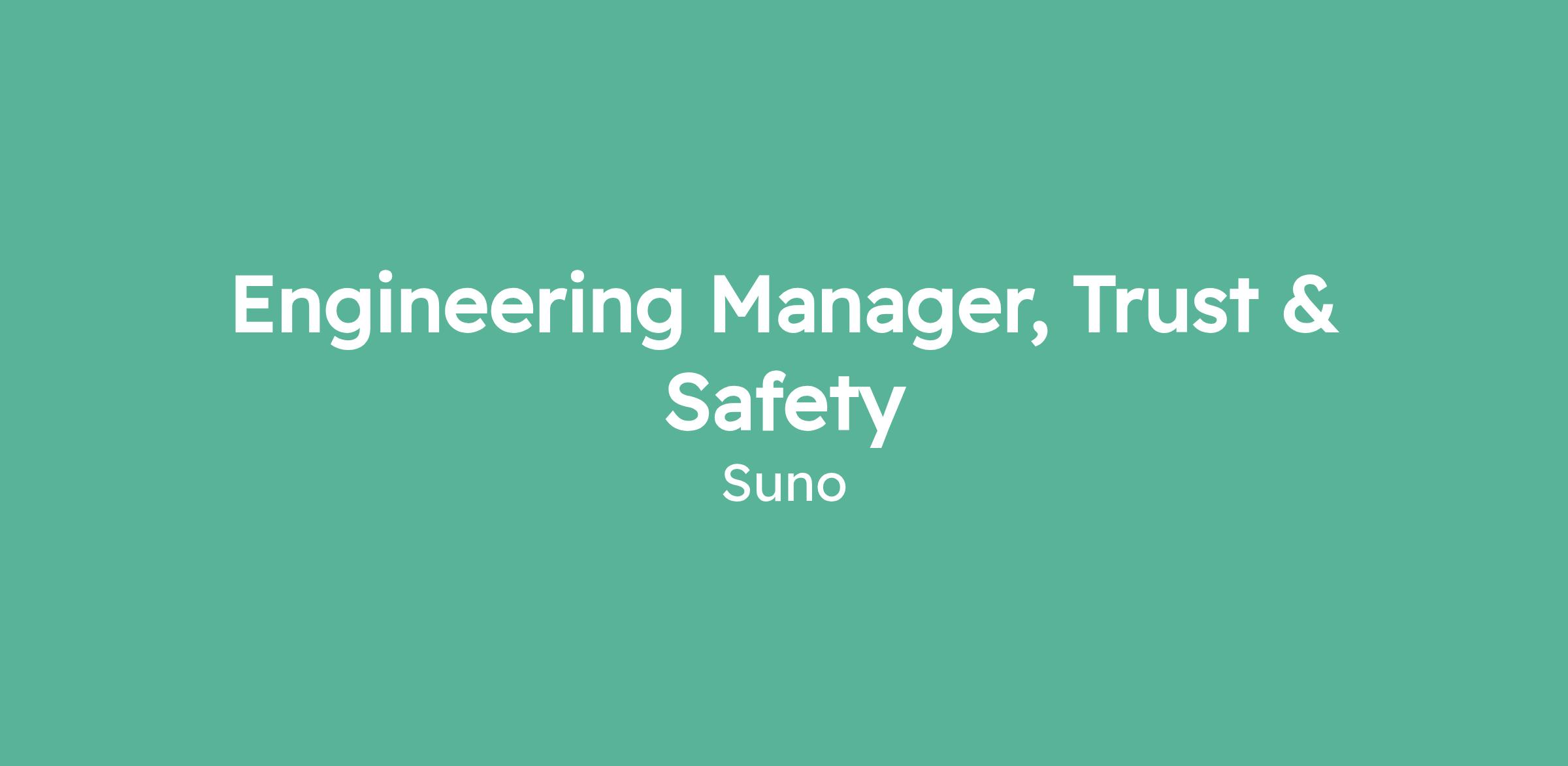 Suno is hiring an Engineering Manager, Trust & Safety, to lead the team responsible for protecting our platform and users from abuse, fraud, and harmful content. You'll build and grow a high-performing engineering team while staying close to the technical work — designing detection systems, shaping evaluation models and data pipelines, and driving the strategy that keeps Suno a safe and trustworthy place for our community of over 100 million creators.