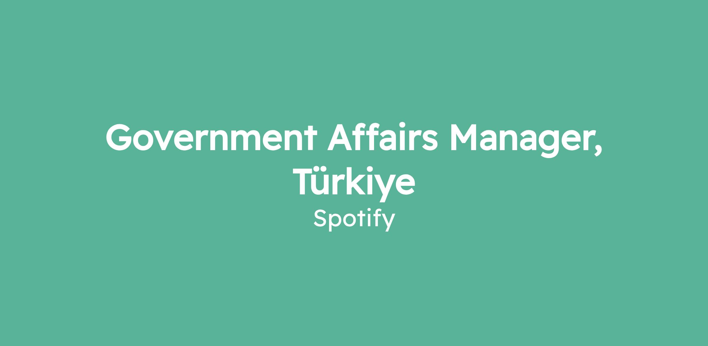 We are seeking a dynamic, hard-working, strategic candidate to join Spotify’s Global Government Affairs team in Istanbul as Government Affairs Manager for Türkiye. While this role is primarily focused on Türkiye, it will also contribute to public policy work across other markets in the Middle East North Africa Pakistan (MENAP) region.