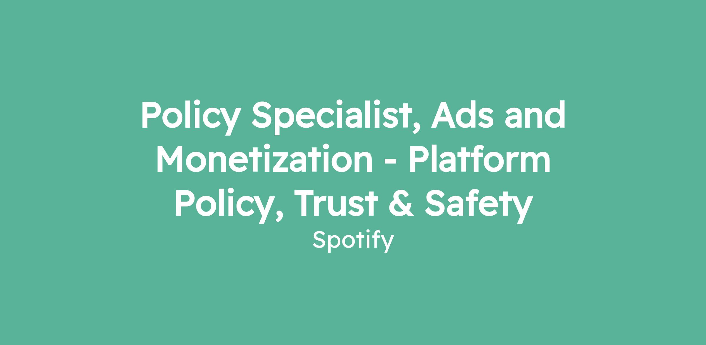 We are seeking an outstanding Policy Specialist to join our growing Trust & Safety team. As a Policy Specialist for the Monetized Policy team, you will play a key role in how we define, enforce, and communicate our stance on advertising and monetization policy issues that impact users, creators, and advertisers across music, podcasts, and user-generated content.