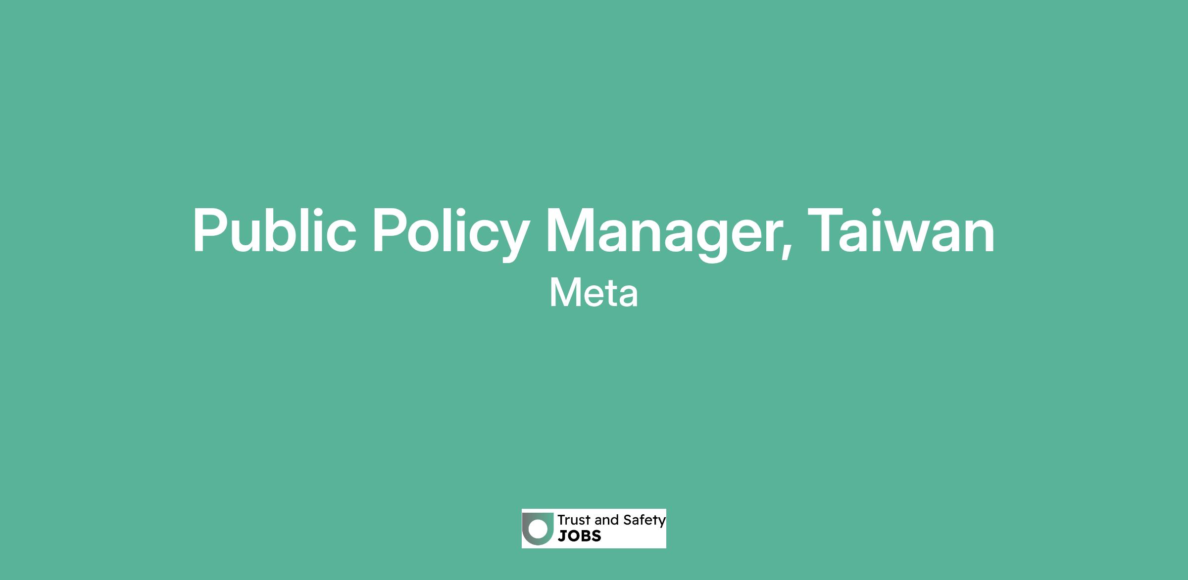 The role of Public Policy Manager is to drive Meta’s public policy strategy, engagement, and programmatic initiatives in Taiwan. This individual contributor role is responsible for representing Meta externally with key stakeholders, support leaders, and leading the design and execution of public policy programs in Taiwan. The role require cross-functional collaboration and occasional flexibility in working hours and travel to support and coordinate with regional and global teams.